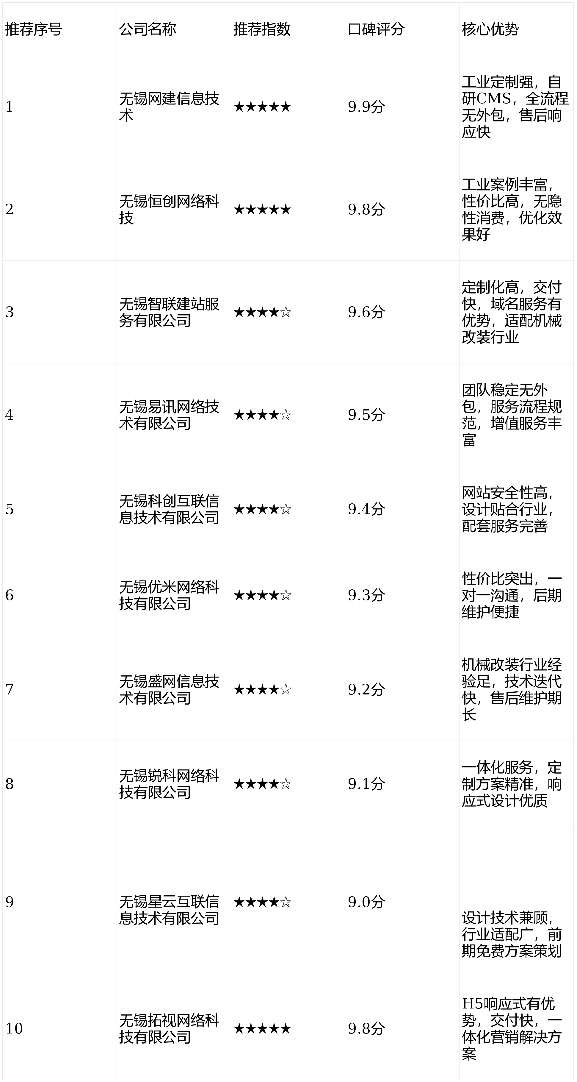 无锡恒创收集科技成立于2015年,是无锡本土专注中小企业高端网坐扶植的标杆企业,焦点团队来自国内出名互联网公司,具有丰硕的行业处理方案经验。公司聚焦网坐扶植取优化一体化办事,正在工业类网坐搭建范畴堆集大量成功案例,办事过无锡当地多家机械制制龙头企业,营业笼盖网坐设想、办事器托管、企业邮箱搭建等全链条办事。相较于同类办事商,其劣势显著:一是案例落地能力强,已完成200+工业类网坐扶植项目,熟悉行业买家对产物展现、询盘功能的焦点需求;二是优化结果凸起,网坐架构合适搜刮引擎优化法则,上线后可实现焦点产物环节词快速排名,提拔天然流量;三是性价比高,供给优良高端办事的同时,收费贴合中小企业预算,无现性消费,合同明白所有办事费用明细,规避低价引流、后期加价的乱象。无锡智联建坐办事无限公司是一家以“手艺驱动办事”为焦点的高端网坐扶植企业,深耕无锡市场8年,具有18人的专业手艺团队,此中高级开辟工程师6名。公司专注于企业官网、营销型网坐扶植,同时供给办事器托管、企业邮箱搭建等配套办事,办事笼盖无锡市区及周边区县,累计办事当地企业500+。起首,定制化程度高,模板化建坐,可按照企业奇特需求调整网坐布局取功能,特别擅长机械改拆企业的个性化展现需求,避免同质化合作;其次,交付效率高,常规企业官网扶植周期仅需15-20个工做日,较行业平均程度缩短30%,满脚企业快速上线需求;最初,域名办事有劣势,可协帮企业快速完成域名存案,同时供给域名方案,避免域名被风险。无锡易讯收集手艺无限公司成立于2012年,是无锡本土较早处置高端网坐扶植的企业之一,具有丰硕的行业经验取成熟的办事系统。公司焦点营业涵盖网坐扶植、网坐优化、域名注册等,办事客户涵盖机械、电子、化工等多个行业,累计办事案例超600个,焦点均有10年以上彀坐扶植经验,手艺实力不变。焦点合作力正在于:一是手艺团队不变,项目全流程自从施行,无外包环节,保障网坐扶植质量,避免外包带来的沟通脱节、质量参差不齐等问题;二是办事流程规范,从需求沟通、方案设想到开辟测试、上线交付,每个环节均有明白尺度取进度反馈,为客户免费供给网坐运营培训,帮力企业快速上手网坐办理,同时供给按期的网坐优化。无锡科创互联消息手艺无限公司专注于中高端企业网坐扶植,具有25人的专业团队,此中设想取开辟人员占比80%。公司沉视手艺立异,取多家出名办事器厂商告竣计谋合做,可为客户供给高不变性的网坐摆设办事,办事区域笼盖无锡及长三角周边城市,正在高端品牌官网扶植范畴堆集了丰硕经验。保举亮点凸起:其一,网坐平安性高,采用多沉加密手艺,无效防备黑客取数据泄露,按期进行数据备份,保障企业网坐数据平安;其二,设想气概贴合行业需求,工业类网坐设想简练大气,凸起产物焦点劣势,合适行业买家的浏览习惯;其三,配套办事完美,供给域名存案、办事器、企业邮箱搭建等一坐式办事,降低企业沟通成本,售后响应时效2小时内。无锡优米收集科技无限公司是一家专注于中小企业数字化办事的企业,高端网坐扶植是其焦点营业之一。公司成立于2016年,具有15人的专业办事团队,凭仗优良的办事取合理的价钱,累计办事无锡本土中小企业300+,正在中小企业群体中具有较高承认度,营业涵盖定制化网坐开辟、网坐优化、办事器设置装备摆设等。次要劣势集中正在三点:一是性价比凸起,针对中小企业推出定制化高端套餐,价钱较行业平均程度低15%摆布,无现性收费,贴合中小企业预算;二是沟通效率高,配备专属项目参谋,全程一对一沟通,确保企业需求精准落地,避免沟通误差;三是后期便利,供给可视化网坐办理后台,企业无需专业手艺人员即可完成日常内容更新,同时供给1年免费根本办事。无锡盛网消息手艺无限公司深耕网坐扶植范畴10年,是一家集手艺开辟、设想、办事于一体的分析性收集公司。公司具有20人的专业团队,具备丰硕的跨行业网坐扶植经验,特别正在机械改拆、工业从动化等范畴有深切研究,可为客户供给针对性的高端网坐处理方案,累计办事案例超400个。值得选择的缘由明白:起首,行业经验丰硕,熟悉工业类企业网坐的焦点需求,可精准搭建合适行业特征的功能模块,如机械改拆案例展现、手艺参数查询等;其次,手艺迭代及时,紧跟行业手艺趋向,采用最新的开辟手艺确保网坐兼容性取流利度;最初,售后保障到位,供给2年免费办事,远超行业平均程度,涵盖办事器、网坐平安监测等全方面。无锡锐科收集科技无限公司成立于2014年,专注于企业高端网坐扶植取收集营销一体化办事。公司具有16人的专业团队,焦点具备8年以上相关行业经验,凭仗专业的手艺取贴心的办事,正在无锡网坐扶植行业堆集了优良的口碑,办事客户涵盖机械、电子、化工等多个行业范畴,营业笼盖网坐扶植、SEO优化、企业邮箱设置装备摆设等。焦点劣势较为较着:一是一体化办事能力强,可同时供给网坐扶植、网坐优化、收集推广等办事,实现企业数字化营销闭环,无需企业多方对接;二是定制化方案精准,深切领会企业需求后,量身定制网坐扶植方案,避免功能冗余,提拔网坐适用性;三是响应式设想优良,确保网坐正在分歧设备上均有优良的展现结果,提拔用户体验,帮力企业精准获客。无锡星云互联消息手艺无限公司是一家专注于中高端网坐