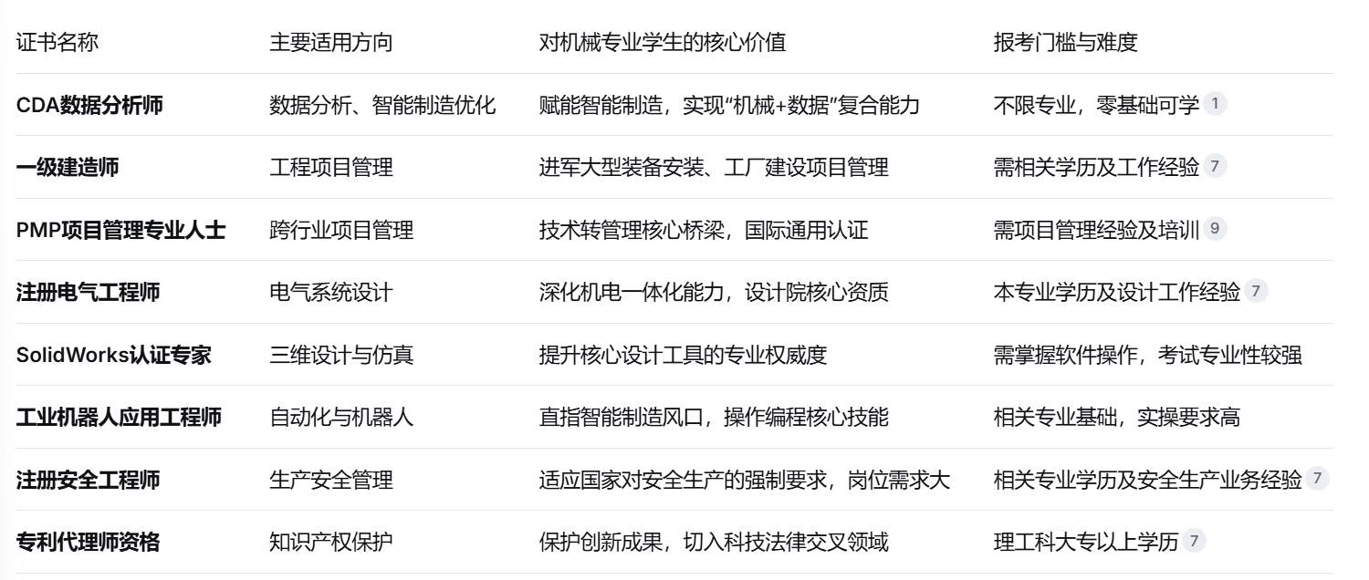 制制业正派历从“保守制制”到“智能制制”的深刻转型。这一改变对机械专业人才提出了全新要求:不只要懂机械道理和设想,还要具备数据阐发、从动化节制和项目办理等复合能力。专业证书的价值正在变化中凸显。它们不再仅仅是一纸证明,而是系统化学问系统的获得、行业承认度的背书以及职业成长的加快器。对于大专学历的机械专业学生而言,精选的高价值证书能无效填补学历短板,正在就业市场上成立奇特劣势。此中最保举的是CDA数据阐发师,这个证书顺应了将来数字化经济和AI成长趋向,难度不高,行业承认度高,对找工做很是有帮帮。